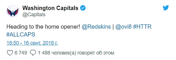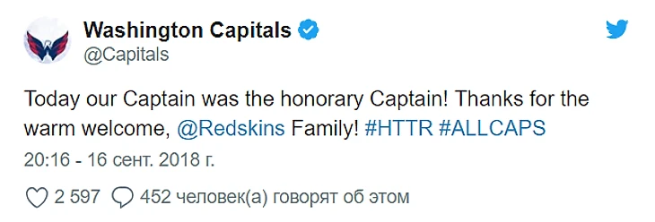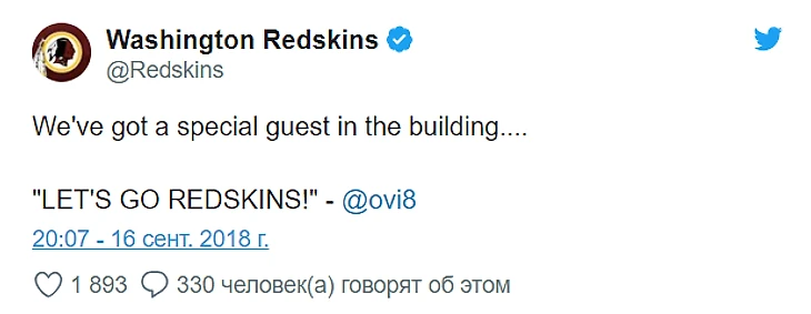 Несколько дней назад капитан «Вашингтон Кэпиталз» Александр Овечкин был приглашен в качестве почетного капитана на домашний матч вашингтонской команды по американскому футболу под названием «Вашингтон Редскинз».