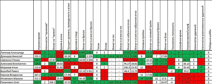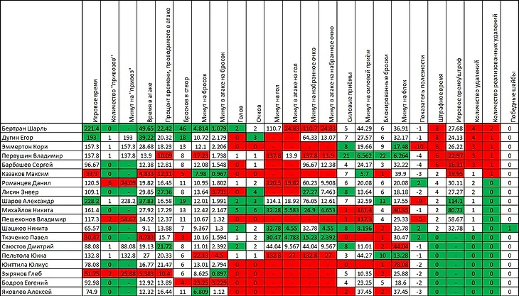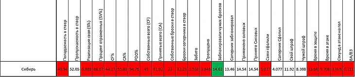 Начнём с командной статистики. Сибирь после тринадцати матчей имеет в активе лишь одну победу и занимает последнее место в турнирной таблице. Разница забитых и пропущенных голов худшая в Лиге – «-30». Реализация большинства – предпоследнее место и 11,1%, ровно столько же по игре в меньшинстве (23е место из 25). Теперь немного собственных расчетов. Чем перечислять все цифры и писать, в чём Сибирь худшая, просто приведу строчку клуба из общекомандной сводной таблицы. Зелёным выделены показатели, по которым команда входит в пятёрку лучших, красным – в пятёрку худших. Как говорится, комментарии излишни. На данный момент Сибирь – самая слабая команда КХЛ.