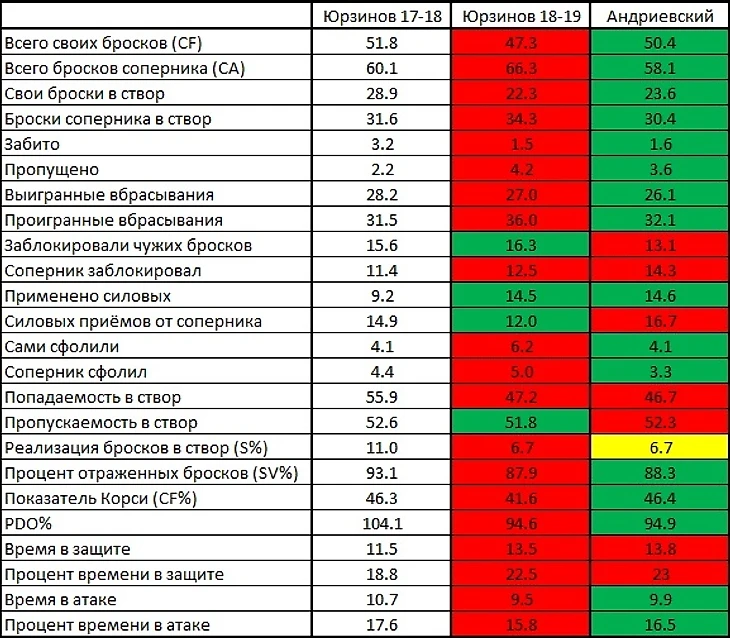 Немного о тренерах. Первые шесть матчей командой управлял Юрзинов, после его сменил Андриевский. По четырём стартовым играм стало понятно, что предсезонная подготовка была провалена полностью. Ни сыгранности, ни физики, ни модели игры. Чем занимался Юрзинов всё лето – большой вопрос. Увольнение его после таких результатов не стало неожиданным. В принципе, по цифрам в таблице всё предельно понятно. Почти все показатели в этом «юрзиновоском» сезоне «просели» относительно предыдущего. Цифры Андриевского пока лучше, чем у «Юрзинова 2018-19», но хуже прошлогодних. На изменение ситуации потребуется немало времени.