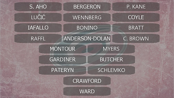 Общий драфт, взрослые выборы: Бержерон (1-5), Кроуфорд (2-5), Монтур (3-5), Веннберг (4-5), Т. Майерс (4-7), Гардинер (4-15), Койл (5-5), Братт (6-27), Лучич (7-5), Кэм Уорд (8-18), Милано (8-27), О. Уотсон (9-5), Бонино (9-11), К. Браун (11-5), Патерин (13-5), Шлемко (18-27), Раффль (19-5).