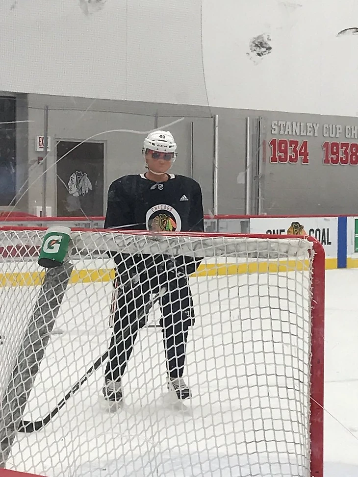 Центрфорварду Чикаго пришлось внимательно присмотреться к двум фигурам у скамейки запасных на льду тренировочного катка MB Ice Arena. Сначала он принял их за игроков.
