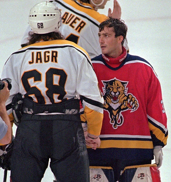 Легендарный вратарь Пантерз Джон Ванбисбрук утешает молодого Яромира Ягра, ведь только что Флорида вышла в финал Кубка Стэнли, обыграв Питтсбург 4-3 в серии. Ванбисбрук впервые за 13 лет в лиге вышел в финал Кубка Стэнли.