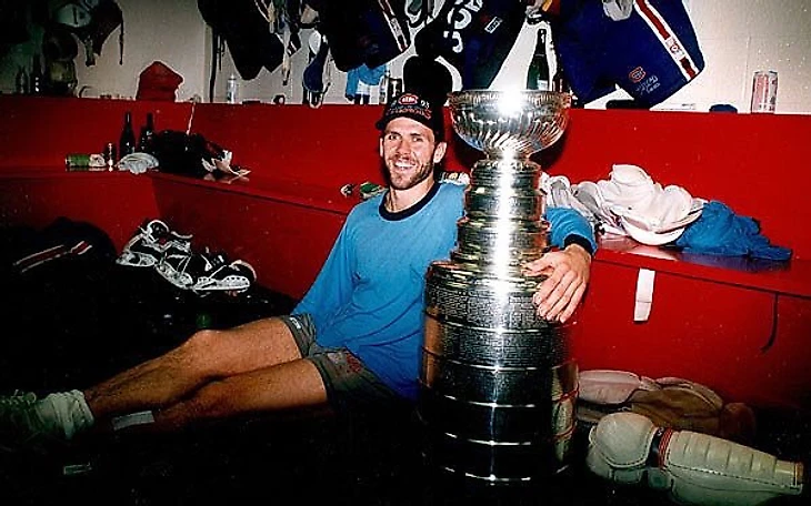 Эрик Дежарден в непринужденной обстановке с Кубком Стэнли в обнимку. Дежарден «отжигал» в плей-офф, набрал 14 очков. Кстати, Дежарден-единственный защитник, кто сделал хет-трик в финале Кубка Стэнли.