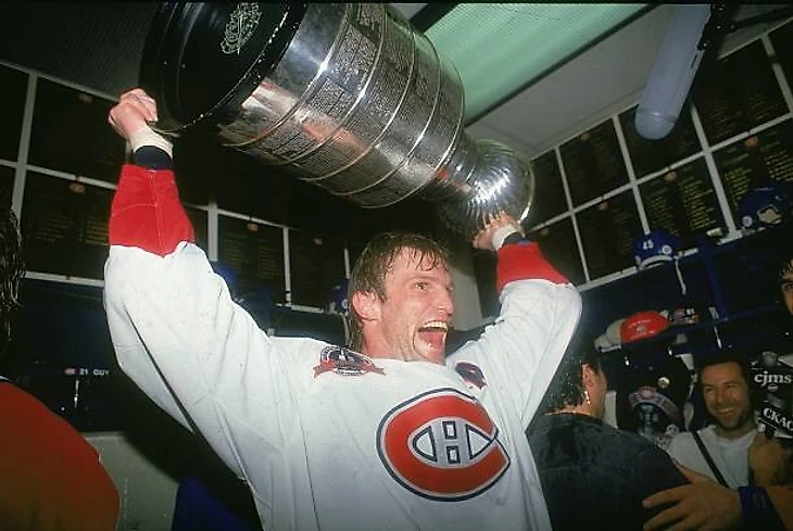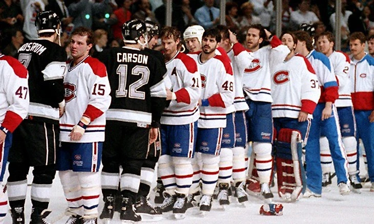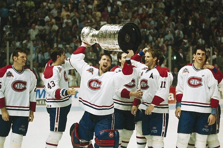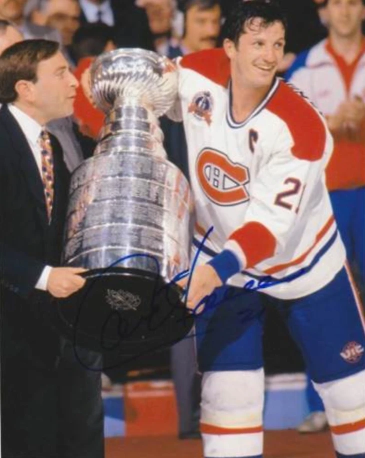 Ги Карбонно берет из рук Гэри Бэттмена Кубок Стэнли. Карбонно был капитаном того Монреаля, сменив на этом посту Боба Гейни в 1989 и пробыв в таком статусе до 1994-го. Карбонно дважды выигрывал Кубок с «Хабс» и один раз, под конец своей карьеры выиграл его с Далласом. Кстати, в честь Карбонно, назван трофей в юниорской лиге Квебека, который присуждается лучшим атакующим защитникам турнира.