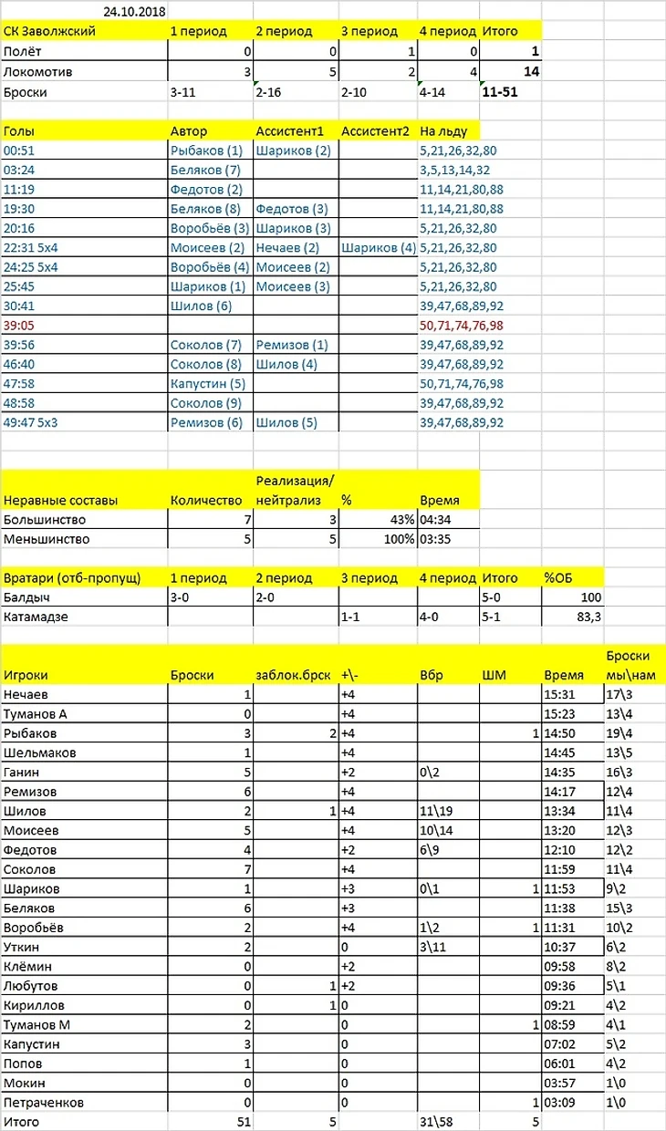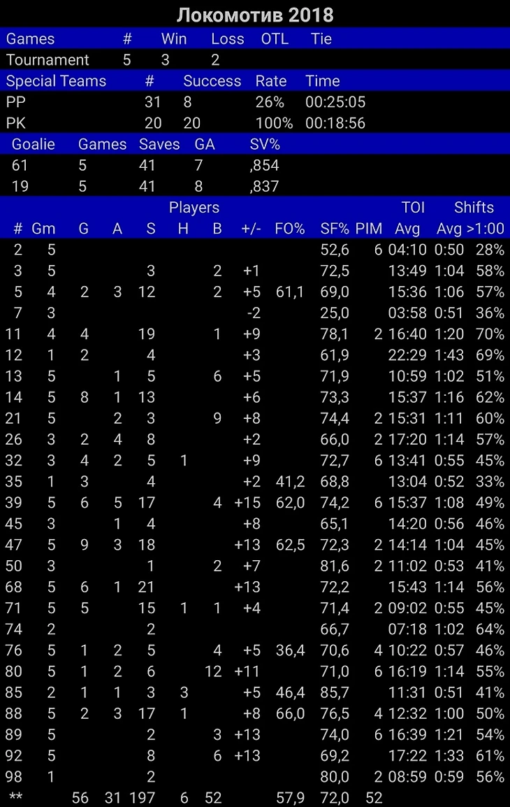 Общая статистика за 5 проведённых игр вроде вся прекрасна. За исключением того, что у нас уже два поражения. И впереди далеко не самые простые игры. А пока…. Пока самый полезный (и это вполне справедливо) – Шилов, самый бросающий – Ремизов, лучший снайпер – Соколов, а лучший бомбардир – опять Шилов. Всех больше бросков на себя принял Рыбаков, лучший на точке – Федотов, самый недисциплинированный – Воробьёв, а больше всех времени на льду у Шельмакова. Мы довольно недурно разыгрываем лишнего, и идеально работаем в меньшинстве. Вот так бы 7 ноября….