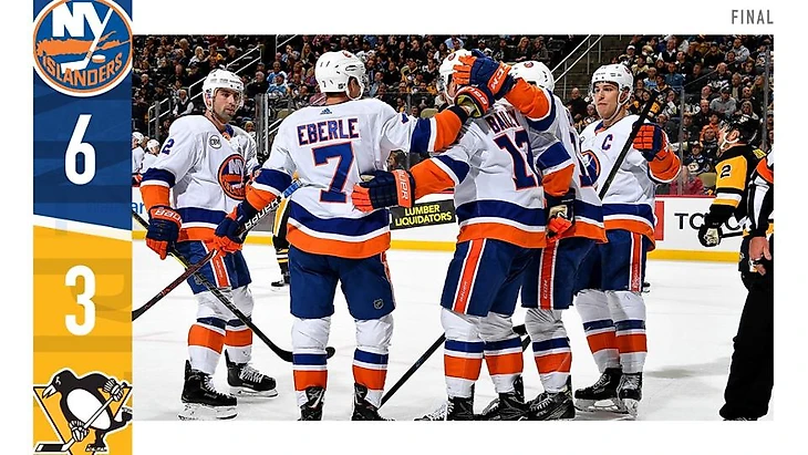 "Питтсбург Пингвинз"-"Нью-Йорк Айлендерс" 3:6.Джордан Эберле забросил 2 шайбы,Мэттью Барзал с Ником Лэдди и Райаном Пулоком отдали по 2 результативные передачи,Мэтт Мартин набрал 2 очка,Робин Ленер отразил 23 броска.У хозяев Сидни Кросби набрал 2 очка (1+1),Джейми Олексиак отдал 2 результативные передачи,Евгений Малкин забросил одну шайбу."Островитяне" выиграли 3 матч подряд.