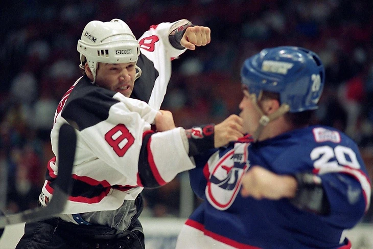 Майк Пелузо выясняет отношения с соперником. В том сезоне Пелузо «навыяснял» отношений на 167 штрафных минут. Всего, именитый тафгай отыграл 458 игр в НХЛ, 1951 минуту сидя в боксе для штрафников.