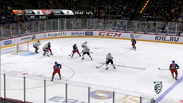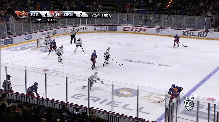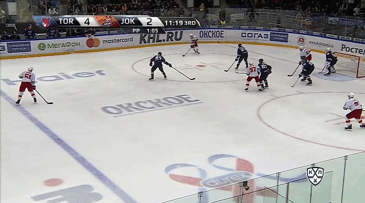 «Йокерит» неплох в контроле шайбы на периметре. Розыгрыш, зачастую, идёт в треугольнике между двумя краями, находящимися на границах кругов вбрасывания и защитником на синей. Алгоритм простой: несколько передач друг другу, траффик перед воротами, бросок от синей или с края. Не важно, как именно зайдет шайба, не прямым броском, так с подставлением или добиванием. Дважды, а это примерно на два больше, чем у других команд в этом материале, финны забрасывали после неточного броска и отскока шайбы от борта за воротами.