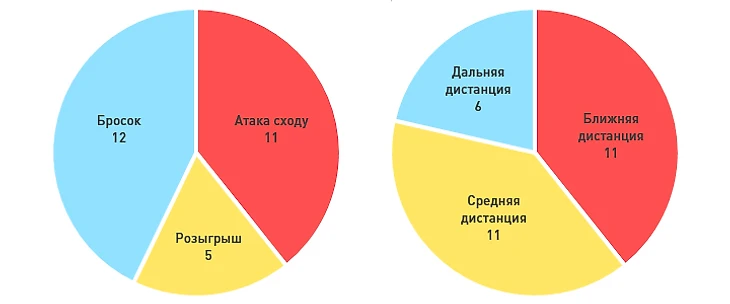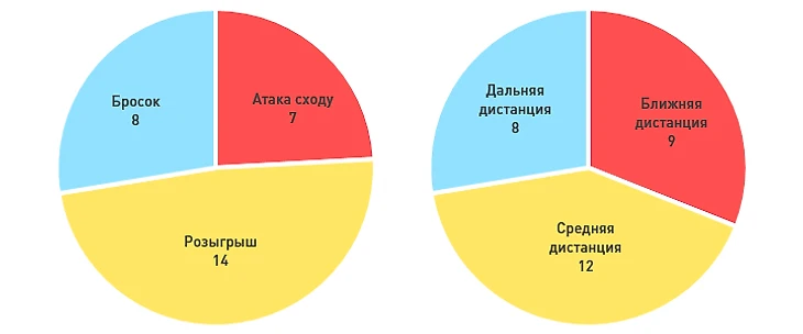 Если же говорить о розыгрыше, то здесь всё завершается переводом в центр, в первую очередь на пятак. Броски после передачи с края на край редки и не особо удачны.