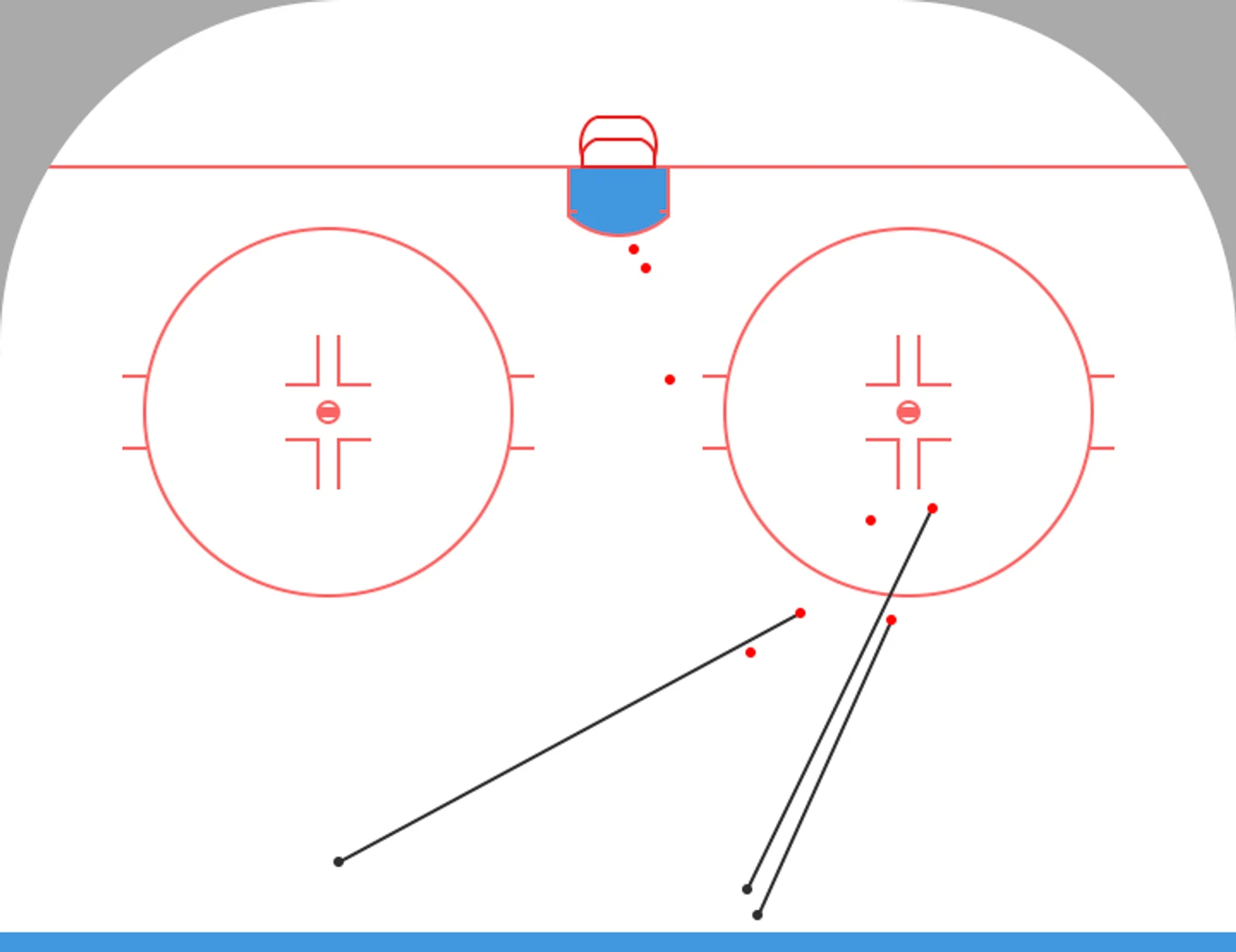 Часть шайб заброшена из правого круга вбрасывания как под копирку. Игрок, изначально находящийся на пятаке, перемещается в сторону по линии ворот (или за ворота), для приёма шайбы и передачи налево.