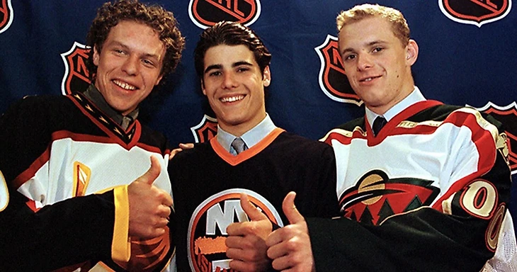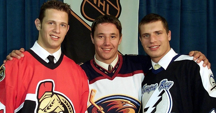 Джейсон Спецца был задрафтован Сенаторз под вторым номером на Драфте-2001. На фото, Спецца, с первым номером драфта Ильей Ковальчуком и Александром Свитовым, которого Тампа выбрала под третьим номером.