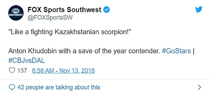 Антон Худобин из «Даллас Старз» совершил настоящее воровство в отношении Пьера-Люка Дюбуа из «Коламбус Блю Джекетс», быстро переместившись в другой угол ворот и выбросив ногу, тем самым оставив равный счет на табло после опасного момента, - пишет о сэйве рожденного в Казахстане российского голкипера Антона Худобина американский сайт «The Sports Daily».