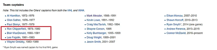 В том самом великом Эдмонтоне первые 4 сезона капитанили 3 игрока, чьи имена мне мало о чём говорят.