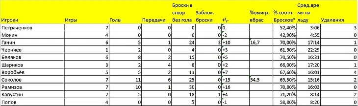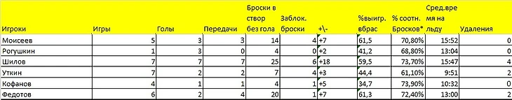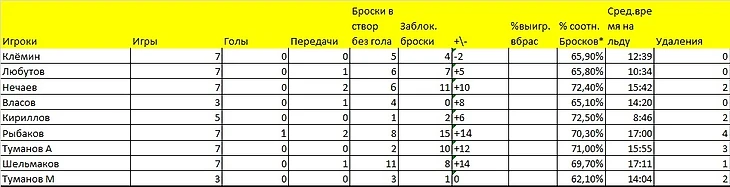 Среди защитников почти по всем показателям у нас бенефис Вани Рыбакова. Больше всех блокирует, удаляется, а ещё и является лучшим бомбардиром среди игроков обороны. Правда, 3 очка – не такая большая цифра. Он же с Захаром делит звание самого полезного защитника. При этом у Клёмина при такой общей разнице забитых и пропущенных (67:24) отрицательный показатель КПД. Интересно, что мы чаще бросаем по чужим, и не даём бросить по своим при Кириллове! А чаще всех воротам угрожал Шельмаков. Сам удивлён, не вспомнил ни одного мало-мальски опасного броска, но это факт.