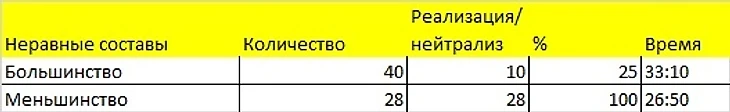 По-прежнему радуют цифры игры в неравных составах. По сути, мы реализуем каждое четвёртое большинство, что очень неплохо для минутных штрафов. И пусть значительная часть реализуется случайно, но всё же было и пару хороших комбинационных шайб. Однако у всех наших положительностей есть один маленький минус – в играх с топ-3 пока грусть. В этот раз мне лень, а в следующий подобью статистику по таким матчам отдельно.