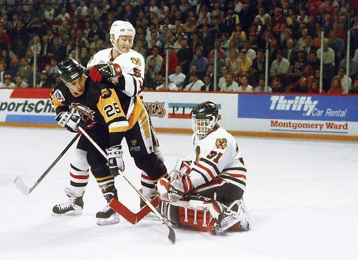 Команда Блэкхокс в те годы была очень хороша. Белфор, Челиос, Гуле, молодой Джереми Рёник, команда того года была сильна, не зря же она играла в финале Кубка Стэнли. Менеджером и главным тренером того Чикаго был небезызвестный Майк Кинэн.