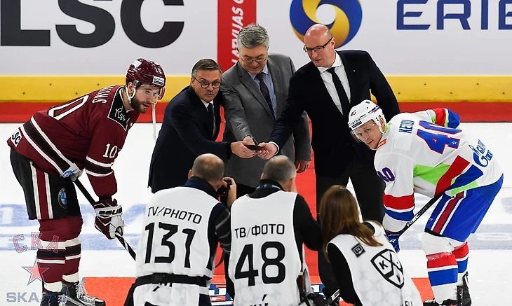 Матч начался с выхода на лёд команды по синхронному катанию «Amber» и детей из академии хоккея Ochsner Hockey Academ, которые выехали на лёд с флагами стран-участниц KHL World Games. Далее звучали гимны. Гимн России исполнил - Андрей Крутой, Гимн Латвии – исполнила Карина Репова. Но как же без проблем? Во время исполнения гимна Российской Федерации произошли технические неполадки со звуком, но игроки хоккейного клуба СКА вместе с болельщиками продолжили петь акапельно. Но это проблема была только с гимном России.