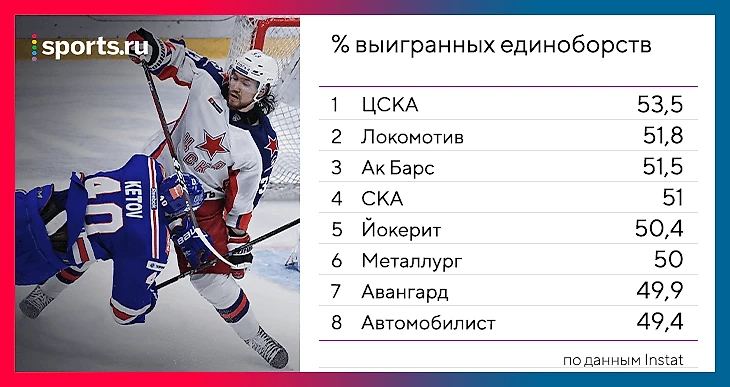 Помимо этого, очень важную роль играют и вбрасывания. Обычно на длинной дистанции этот показатель имеет малое значение – например, пару лет назад лучшей командой НХЛ по вбрасываниям была «Аризона», которая потеряла все шансы на плей-офф еще осенью. В прошлом году «Баффало» занял 7-е место по вбрасываниям, а «Колорадо», попавший в плей-офф, был на безнадежном последнем месте. Но для игры ЦСКА в своей зоне вбрасывания имеют стратегическое значение, и именно из них потом растет успешное противодействие сопернику: