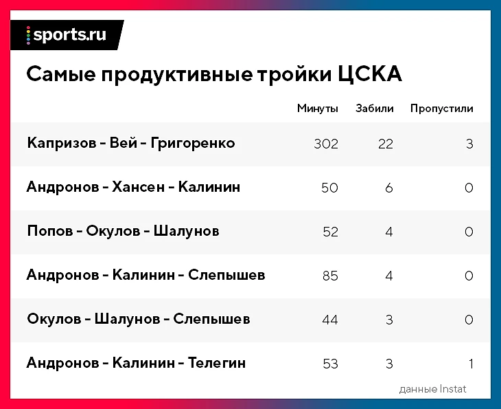 Как мы уже писали, ЦСКА отказался от раздутого состава, а Никитин – от постоянной ротации квартальновского периода, когда рядом с Радуловым мог совершенно внезапно оказаться, например, Геннадий Столяров. В ЦСКА нашли свою суперуспешную тройку Капризов – Вей – Григоренко, которую Никитин практически не трогает и которая постоянно дает результат:
