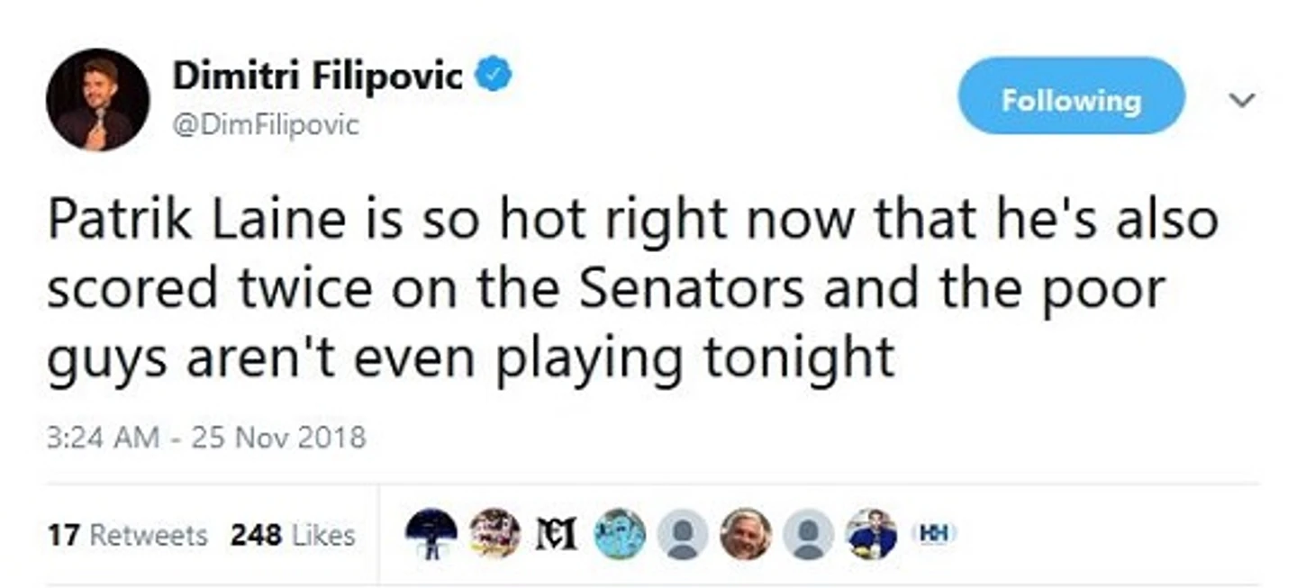Твит месяца: «Патрик Лайне сейчас настолько горяч, что успел забить два гола за «Оттаву», а эти бедолаги даже не играют сегодня», @DimFilipovic