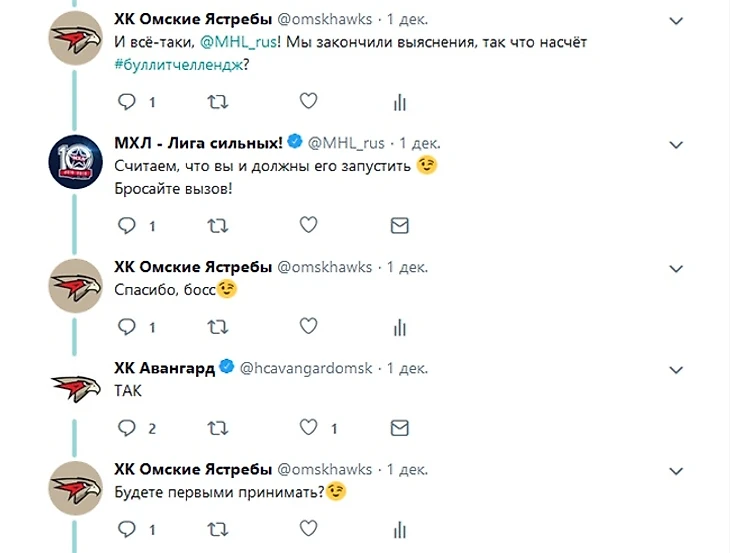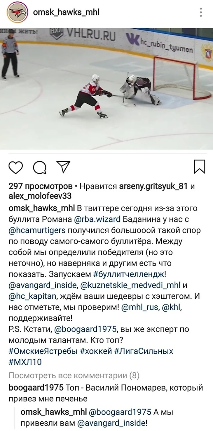 Но главное, к чему привела этак перепалка - #буллитчеллендж, добро на запуск которого дала МХЛ в той же ветке. Возможно, причина в слове "босс", возможно, в самом факте активности, но в этот момент включилась первая команда Омска: