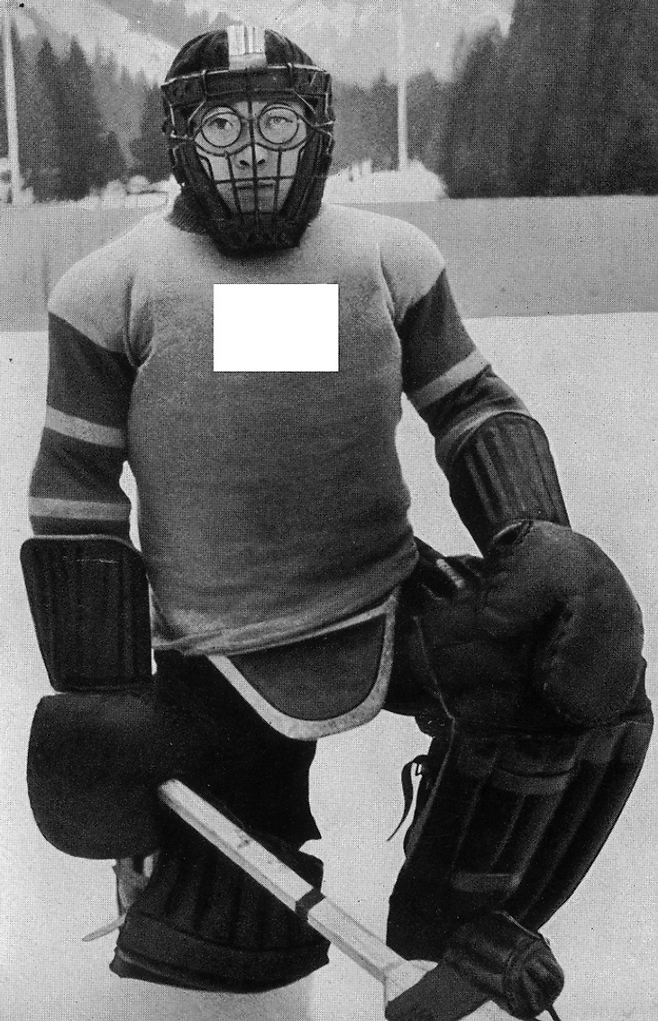 Вот такая картинка из старого хоккейного прошлого вам на обозрение. Кто угадает, что за сборную представляет вратарь, и какие соревнования у него впереди?