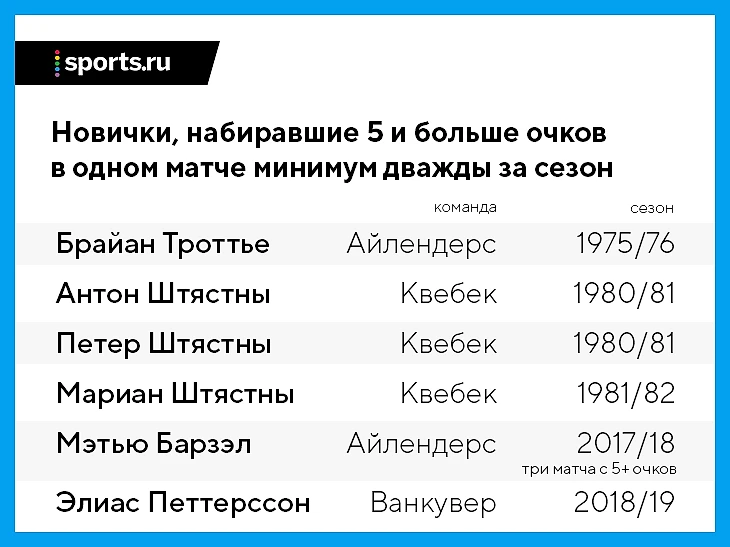 Кроме того, в «Ванкувере» вообще никто не набирал по пять очков в двух матчах сезона, начиная с чемпионата-1995/96 – тогда это сделал Александр Могильный.