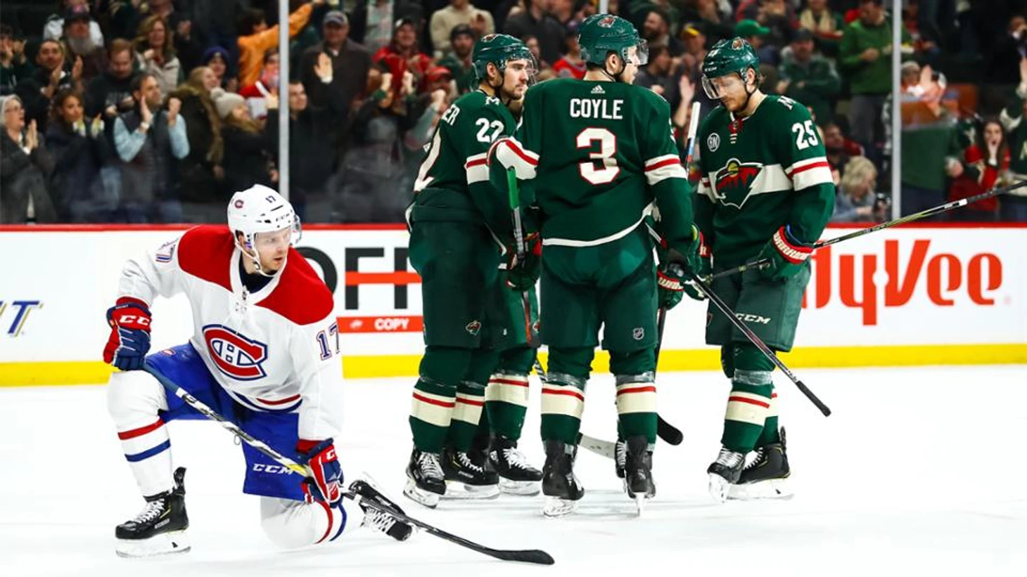 "Миннесота Уайлд"-"Монреаль Канадиенс" 7:1.Зак Паризе набрал 3 очка (1+2),Микаэль Гранлунд отдал 3 результативные передачи,Мэтт Дамба забросил 2 шайбы,Нино Нидеррайтер и Джаред Сперджон набрали по 2 очка (1+1),Райан Сутер отдал 2 результативные передачи,Деван Дубник отразил 29 бросков.Во 2 периоде Ник Силер подрался с Николя Делорье,а в 3 периоде Джей-Ти Браун и Макс Доми получили по 10 минут штрафа.