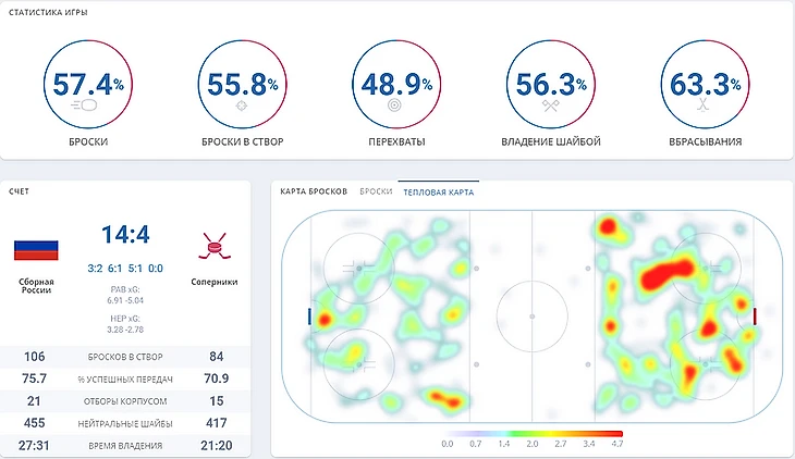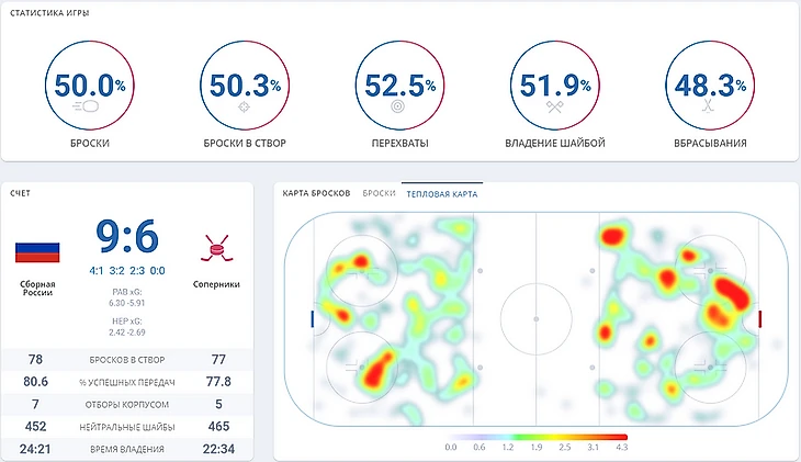 Сборная России прибавила почти во всех ключевых метриках, кроме перехватов, но, учитывая больший процент владения шайбой, падение этого показателя ниже 50% не так критично.