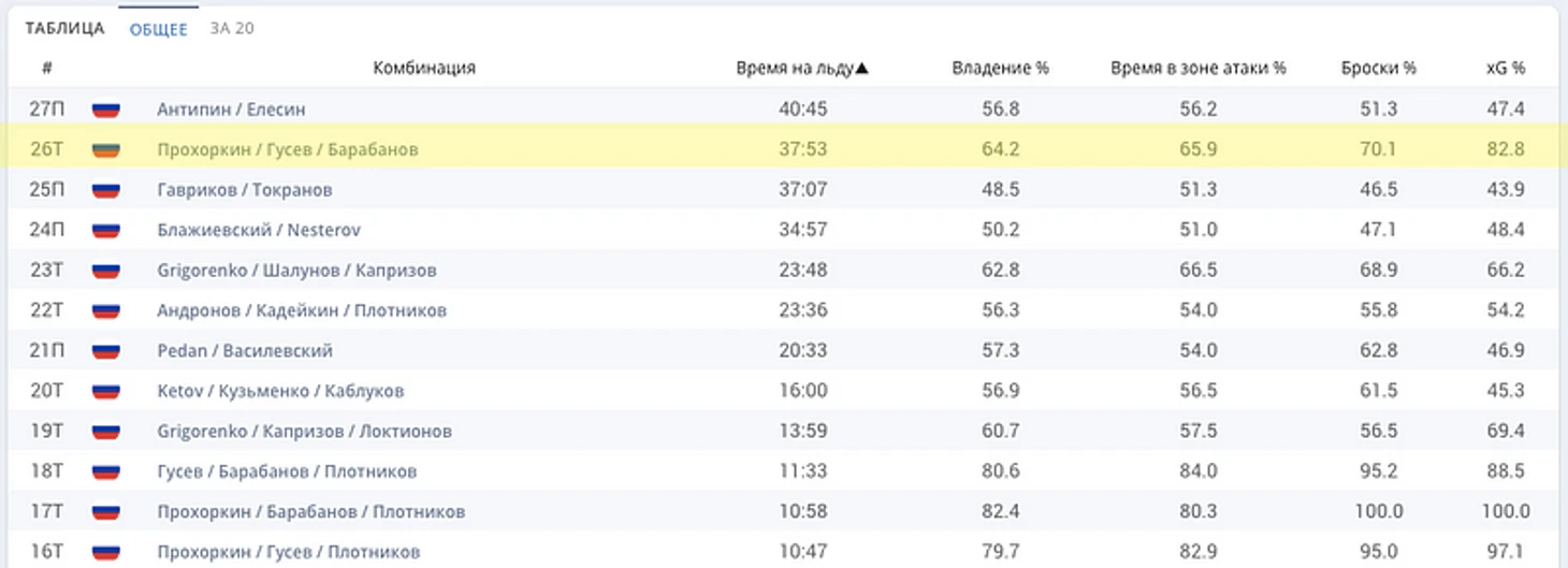 Тройка Гусев – Прохоркин – Барабанов сыграла больше всех среди нападающих (37:53), была наиболее опасна, набрав 82.8% xG, и дольше всех находилась в зоне атаки – 21:07.