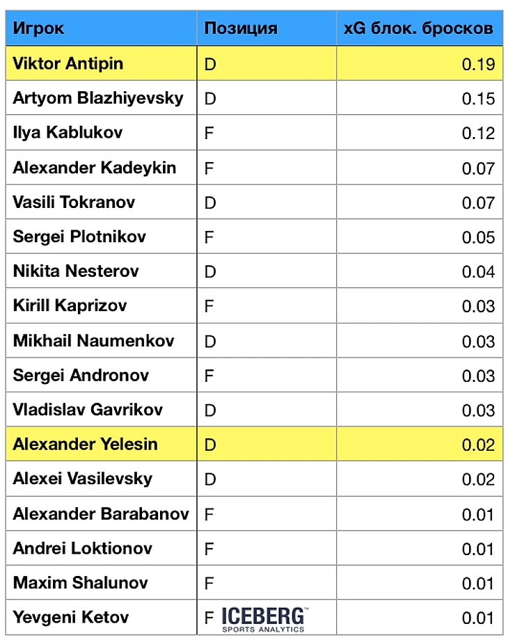 Самая надежная пара защитников – Антипин – Елесин. Да, во время их смен соперники больше всего бросали по воротам, но ни одной шайбы Россия с ними не пропустила. Надежность их игры подчеркивается суммой xG блокированных бросков – 0.21. Этот показатель очень важен, так как любой бросок в хоккее с xG больше 0.07 – опасный.