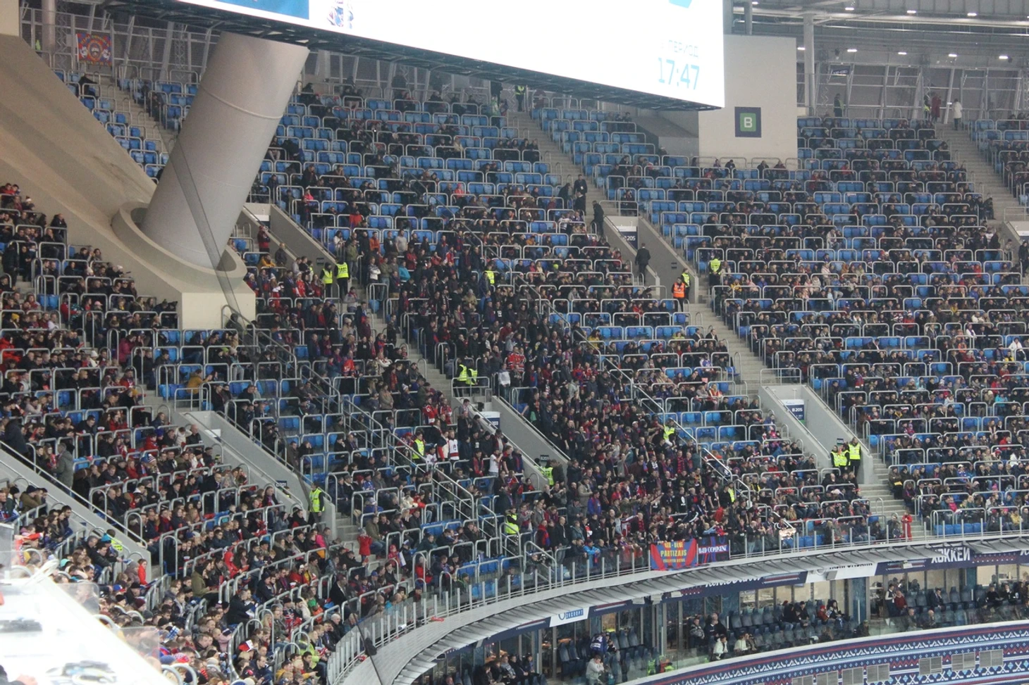 Фанаты ЦСКА – люди в чёрном – собрались на верхнем ярусе, причём с той же стороны, что и фанаты СКА.