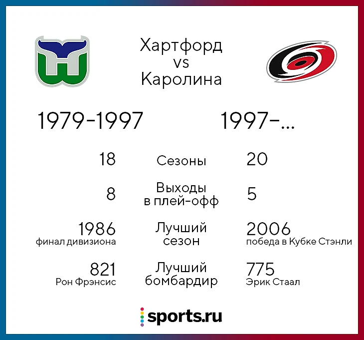 Я понимаю если бы Хартфорд расформировали и потом Каролина через драфт расширения собрала бы состав с нуля, по факту тупо команда переехала со всеми игроками и всего лишь сменила название. Это сродни тому что жил Петя, захотел переехать в другой город и стать Сашей. Ну сменил имя и стал Сашей, но человек-то тот же остался.