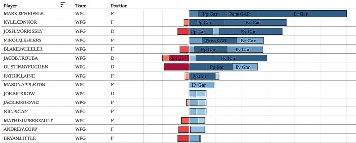 Так вот, в составе «Джетс» по показателю GAR никого даже близко нет к Марку. На втором месте Кайл Коннор, про которого в этом блоге написано достаточно, и проводящий отличный сезон Джош Моррисси.