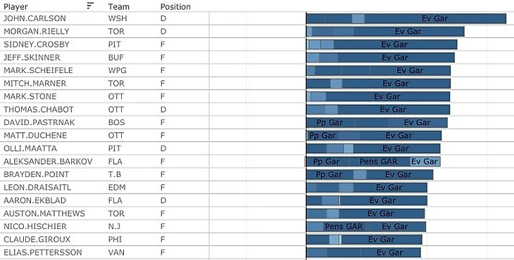 «А GAR 12 это вообще много или мало? – спросите вы. Конечно, до суперсезонов в исполнении Кросби и Макдэвида – GAR от 20 и выше – Шайфли еще далеко, но все, что выше 10, может считаться очень приличным результатом. В масштабах всей лиги Марк занимает 5 место в общем топе, и третье среди всех нападающих, уступая только лишь Кросби и Джеффу Скиннеру.