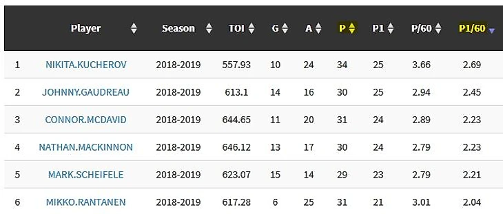 Для того, чтобы оценить атакующие показатели Марка в этом сезоне, возьмем за точку отсчета пятерку самых результативных игроков на сегодняшний день – Кучерова, Рантанена, Макдэвида, Маккинона и Годро. В качестве критерия рассмотрим игру в равных составах, чтобы не было зависимости от уровня реализации лишнего различными командами.