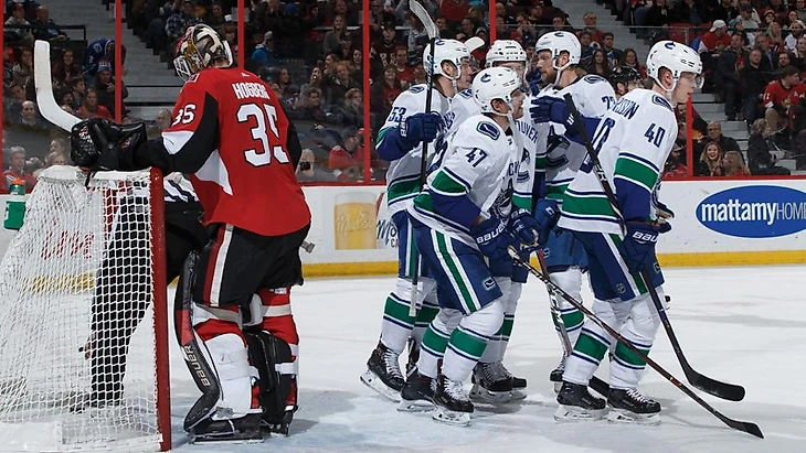 "Оттава Сенаторз"-"Ванкувер Кэнакс" 3:4 (ОТ).Элиас Петтерссон в овертайме принёс победу гостям.Элиас Петтерссон забросил 3 шайбы,Александр Эдлер отдал 3 результативные передачи,Свн Берчи набрал 2 очка (1+1),Брок Бозер отдал 2 результативные передачи,Якоб Маркстрём отразил 30 бросков.У хозяев по 2 очка (1+1) набрали Марк Стоун и Мэтт Дюшен,Райан Дзингел отдал 2 результативные передачи.В первом периоде Бен Харпур подрался с Тимом Шаллером.