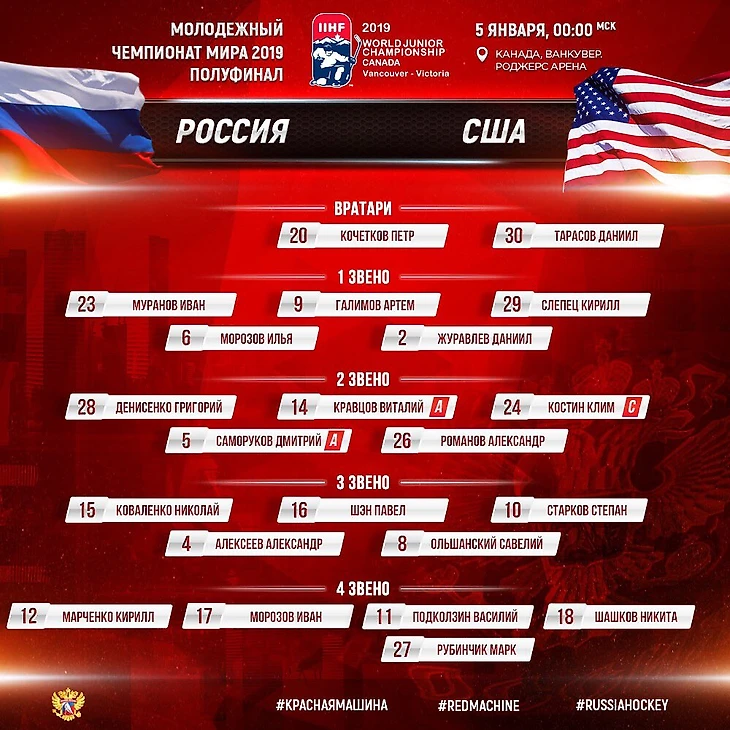19.07 Тогда победную шайбу американцев забросил Джек Хьюз – 17-летняя звезда и потенциальный первый номер на драфте НХЛ-2020. Сыграет ли он сегодня – неизвестно, Джек пропустил три игры на этом МЧМ из-за травмы и вернулся только в четвертьфинале с Чехией, отметившись голевой передачей.