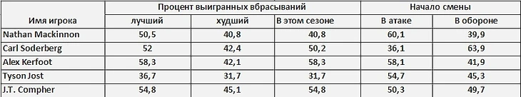 У «Колорадо» этот показатель дает большое место для роста. Особенно, если соотнести его с зоной, в которой начинает смену звено. Звено Маккинонна является лучшим в лиге, но что было бы, если бы свои 60% смен в атаке завершались хотя бы не 40% побед на вбрасывании? Звено имело бы еще больше возможностей забивать.