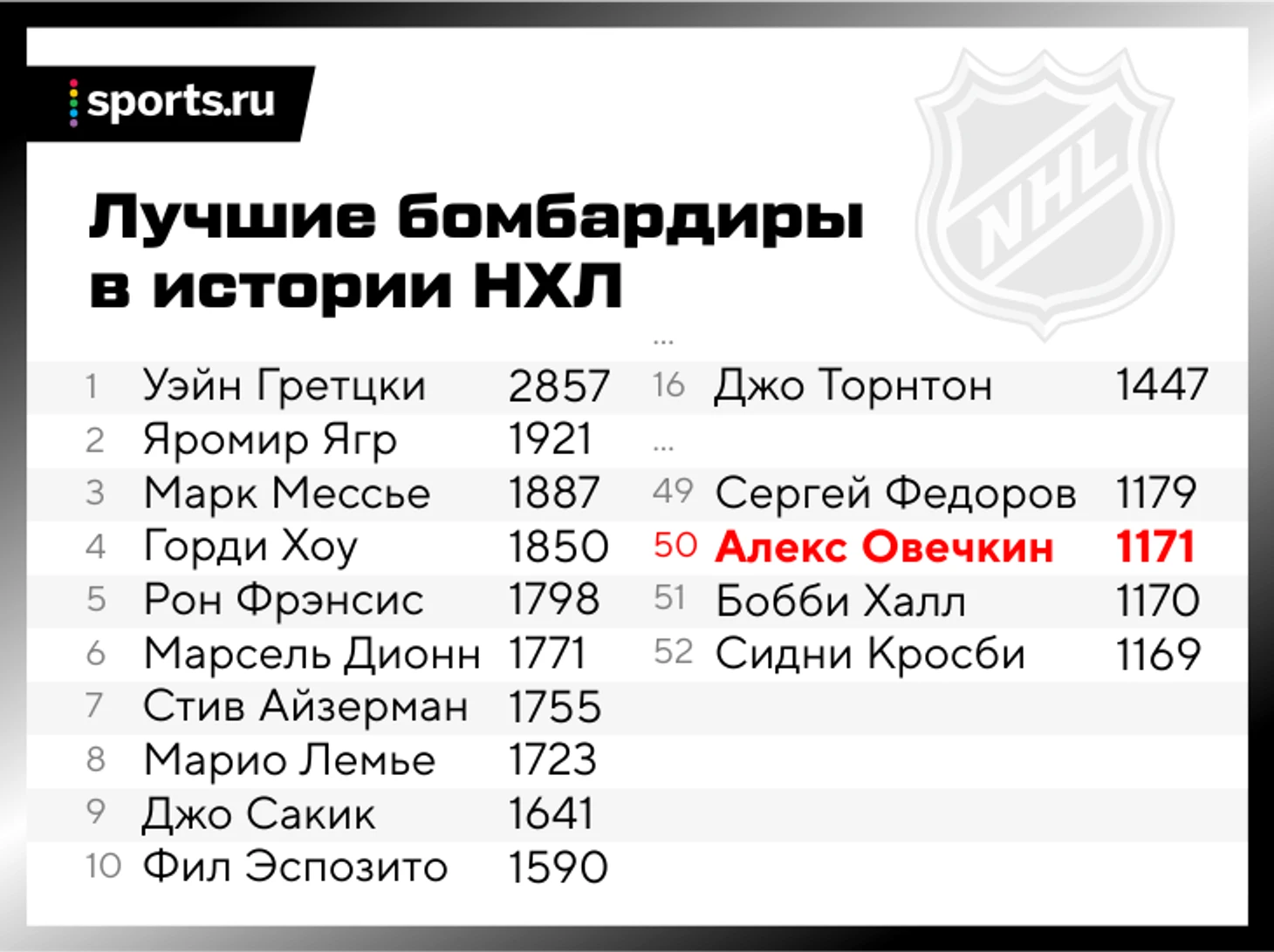 Кроме того, благодаря дублю Овечкин набрал 1171 (639+532) очко в НХЛ и обошел в исторической таблице бомбардиров НХЛ Бобби Халла (1170, 610+560). Теперь Александр занимает 50-е место по результативности в лиге. Кроме него среди действующих игроков в топ-50 только Джо Торнтон – 16-е место, 1447 (405+1042) очков. Лидер – Уэйн Гретцки с 2857 очками.