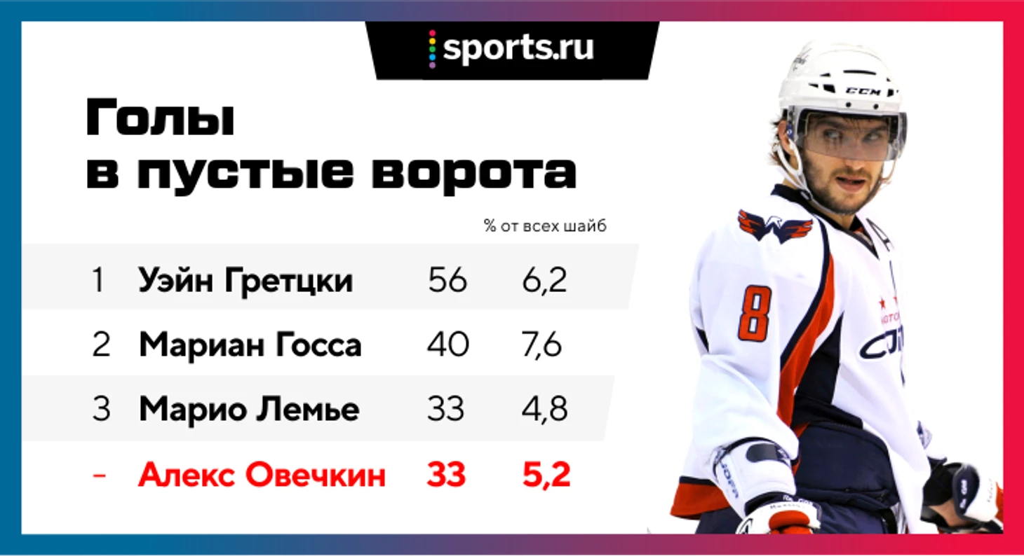 Но даже такие голы сейчас прописывают Александра в истории: эта шайба в пустые ворота стала 33-й в его карьере. По этому показателю он догнал Марио Лемье, но при этом у канадца меньший процент таких шайб от общего количества голов – 4,8% против 5,2% у Овечкина.
