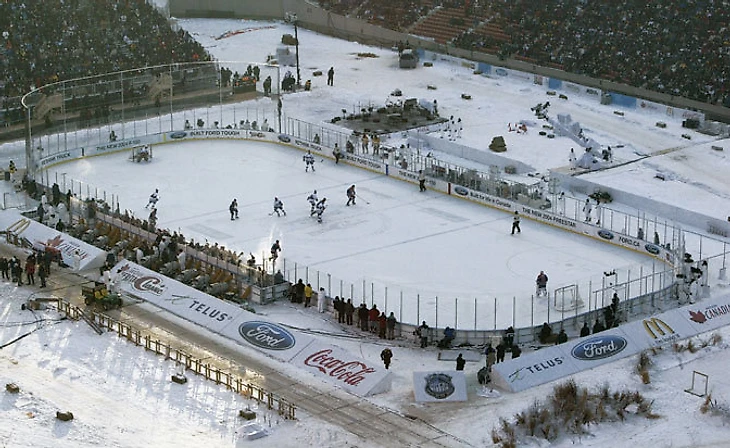 6 лет назад руководители немецкого хоккея захотели перенять опыт матчей под открытым небом у своих заокеанских коллег из НХЛ. Те, в свою очередь, вдохновились новым рекордом посещаемости хоккейного матча, который был установлен в 2001 году на встрече двух колледжей из Мичигана. Спустя 2 года, 22 ноября 2003 года, состоялась первая официальная игра на открытом стадионе Содружества в Эдмонтоне между местным "Эдмонтоном Ойлерз" и "Монреаль Канадиенс", которая, несмотря на 18 градусов мороза, привлекла на трибуны 57.167 зрителей. Это произвело на всех такой фурор, что теперь матчи на свежем воздухе в НХЛ проводятся ежегодно с 2008 года.