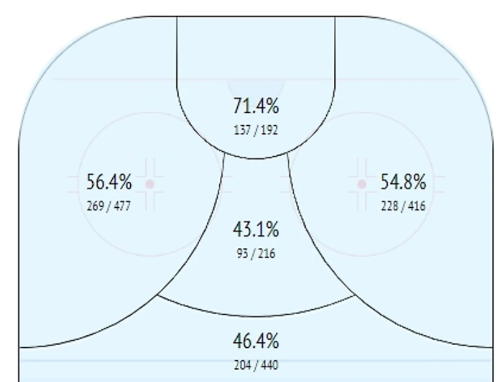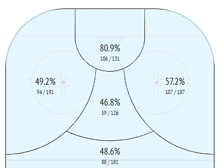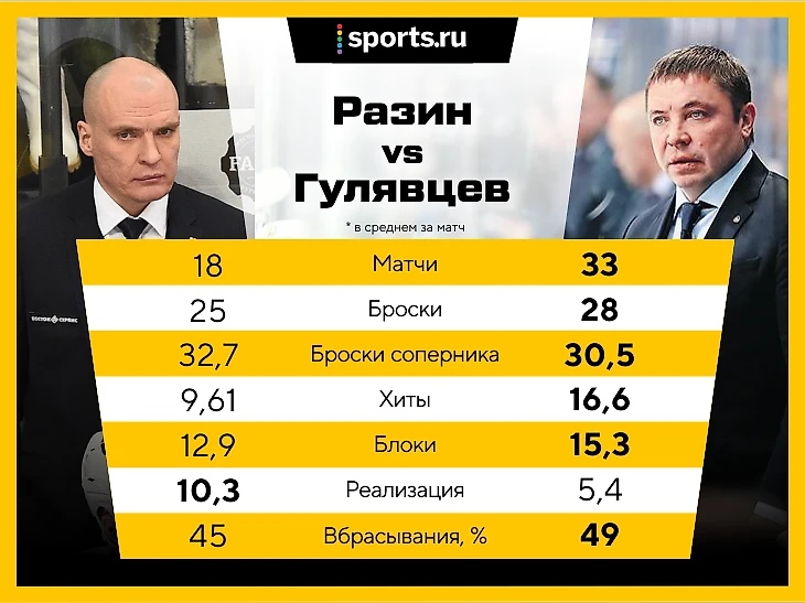 Примерно одинаковое соотношение бросков; силовых приемов и блоков стало меньше – это неудивительно, учитывая габариты команды. Важный компонент, который подтянул Разин – это реализация. Прибавить удалось за счет более эффективных бросков с пятака: разница между командами Гулявцева и Разина – почти 9%, отсюда и результаты.