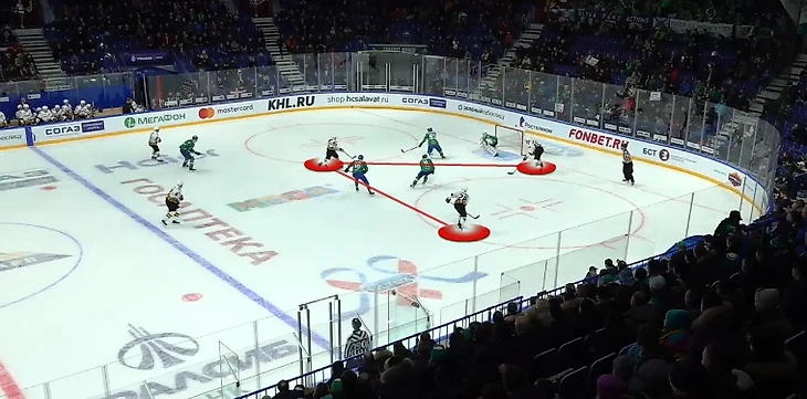 Защитная четверка «Салавата» рвется и череповчане легко вскрывают оборону в два паса, забивая легкую шайбу.