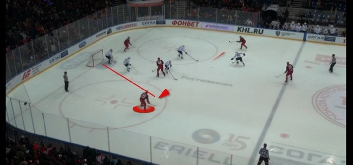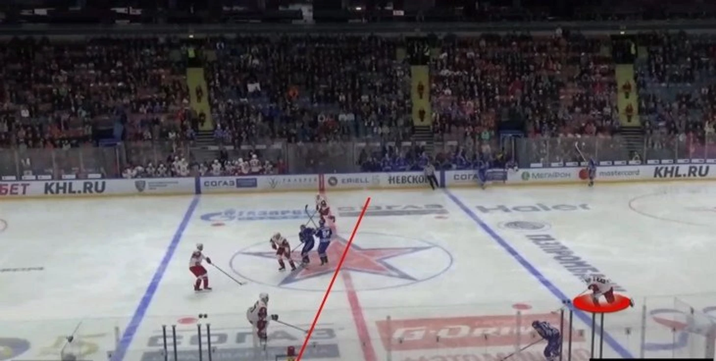 Продолжение эпизода. Игроку СКА предстоит протаскивать шайбу самостоятельно, адресаты передачи под плотной опекой, со спины игрок «Локомотива» идет в бэкчек. Следует вброс в зону – защитник «Локомотива» первый на шайбе.