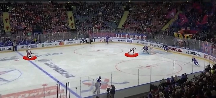 В зоне СКА один игрок ярославцев, второй занимает синюю линию, остальные – в средней зоне. Отдать пас для быстрой атаки просто некому.