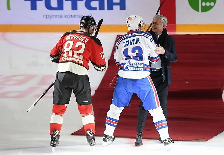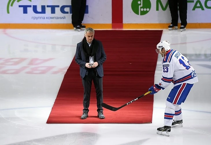 Жозе Моуринью – главный герой понедельника. Он приехал в Балашиху по приглашению «Авангарда», чтобы посмотреть матч омичей против СКА. Перед началом игры португалец должен был провести символическое вбрасывание – и с этим удачно справился, но только он не знал, что нужно жать руки хоккеистам. Когда Моуринью окликнул Павел Дацюк, состоялся самый опасный момент вечера.