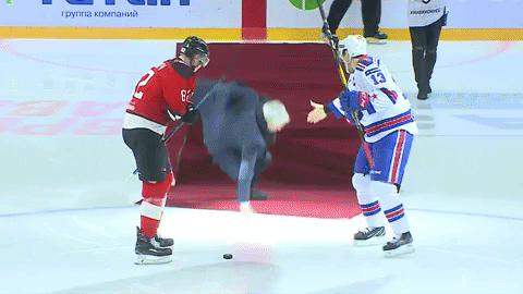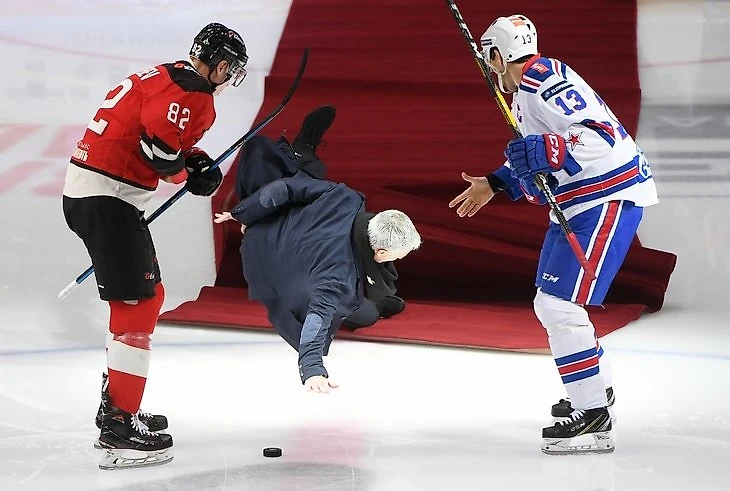 На ютуб-канале КХЛ есть видео с символическим вбрасыванием, но момент падения перекрыт кадрами трибуны – словно ничего и не было.