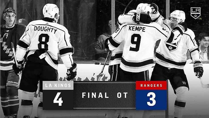 "Нью-Йорк Рейнджерс"-"Лос-Анджелес Кингз" 3:4 (ОТ).Тайлер Тоффоли в овертайме принёс победу гостям.Адриан Кемпе набрал 3 очка (2+1),Илья Ковальчук отдал 2 результативные передачи,Тайлер Тоффоли набрал 2 очка (1+1),Джонатан Куик отразил 24 броска.У хозяев Мика Зибанеджад набрал 2 очка (1+1).