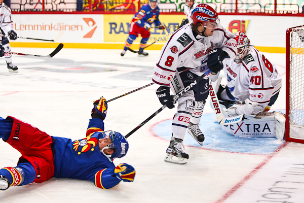 Неожиданно равным (соотношение бросков в сторону ворот 43-45) получился матч в Ювяскюля, где местный JYP (Jyväskylä) при аншлаге в итоге уступил Kalpе (Kuopio) 0-2. Перед началом чемпионата считалось, что хозяева площадки, в основном сохранившие ровный состав, будут по-прежнему штамповать уверенные победы, в особенности на домашнем льду. Однако, игры JYPa и Kalpы также имеют статус дерби (оба клуба представляют Центральную Финляндию), и исторически решающую роль в них играет настрой. Справиться с ним лучше, как оказалось, смогли гости, которые навязали своим соперником равную борьбу по ходу всего поединка, а в начале 3-го периода их капитан и по совместительству основной совладелец Сами Капанен забил "гол из раздевалки", после чего команде из Куопио удалось довести встречу до победного конца и в самой концовке забросить еще одну шайбу, одновременно обеспечив своему голкиперу авторство первого "сухаря" в сезоне. Вратари Мюллюкоски (JYP) 25/27 - Ахонен (Kalpa) 23/23.